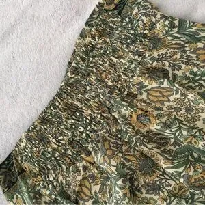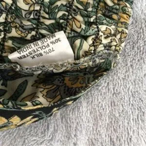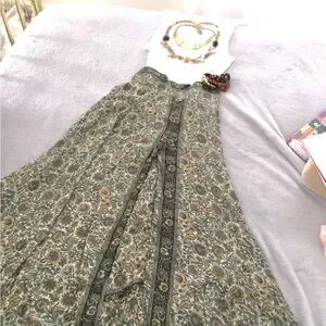 Be prepared to be pampered. Silk blend suddenly flowered pants create an incredible silhouette. Hem is slight high/low. Call out is very small hole at hem’s bottom; reflected in stupid low pricing.