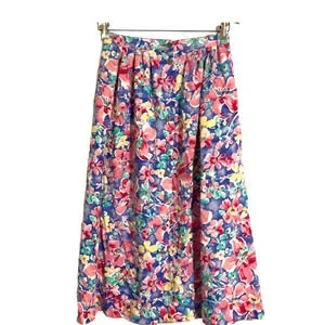 Vintage 80's sky blue skirt with a pink, rose, mint green, & yellow floral pattern all over. 2 side pockets. 9 buttons down front. In great vintage condition.