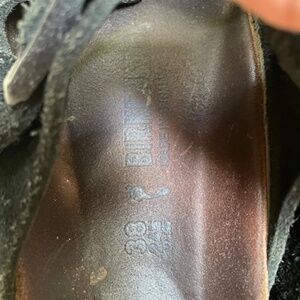 These sandals are in good used condition. The sole is like new, suede shows some wear and the buckles work great. A tiny separation at the left heel-see pic. Many. more miles left on these