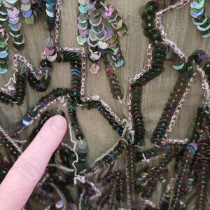 Maharaj Evening Sequin Silk Blouse V Neck3/4 Sleeves, Shoulder pads Iridescent Sequins Size Small Vintage Green Material: Silk and Sequins
