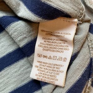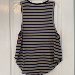 Body of tank top is grey and navy stripes