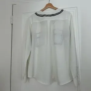 Unique Joe Fresh blouse from 2014 with black screen printed collar, pockets and button seam.