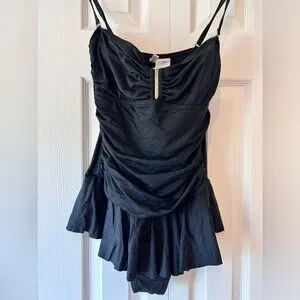 Black one piece, fully lined. Adjustable and detachable straps.