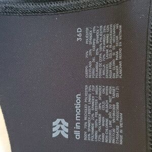 All in Motion 36 D high support, front zip with extra hook and eye for secure fit. Camo colors. Adjustable straps. Moisture wicking.