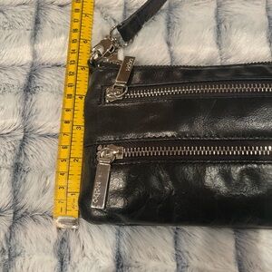 Outside and inside zipper pockets. Card holders pockets inside. Adjustable strap. Can be worn crossbody or hand held.