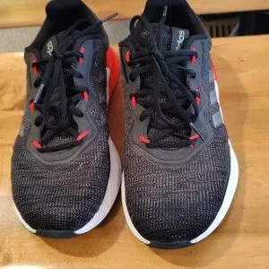 gently used Adidas Kaptir Super Trail running shoes black with orange gray and white accents size 9 .minor marks from use.small crack in plastic shown in picture uppers are basically perfect