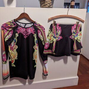 Black, green, pink, orange, white, purple Lucky in Love long sleeve beautiful set. Rare, never made again. Top very gently used, skirt never worn.