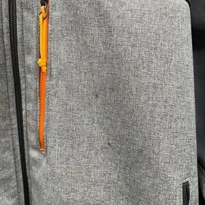 Size Large. Excellent condition just has small tiny stains in front near the left orange pocket zipper above (small 2-3 dots) hardly noticeable. Most would not notice if I did not point out. However, I like for my items to come with no surprises to the buyer. The color of the jacket is dark grey, light grey, and orange.