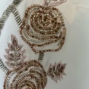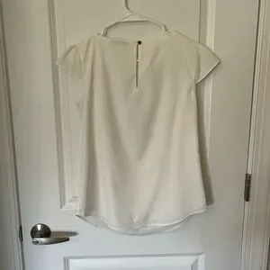 Blouse from White House Black Market with beautiful beaded floral pattern on front. Cap sleeves and buttons in back. A couple of the rows of beads have come off as pictured (reflected in price) but not very noticeable at all. Only worn once!