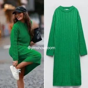 Medium knit. Cable knit fabric. Straight design. Long design. Rounded neck. Long sleeve.