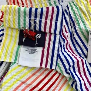 NWT. Seersucker Volley Swim Trunk for Men Various Sizes. Stripes - yellow, orange, red, green, blue, white, purple, pull on, elastic waist with adjustable strap, 2 side pockets, back right side pocket with velcro for closure, internal lining, split hem sides. As per tag it is "8 inch" inseam. Pictures are part of description.