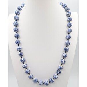 Vintage Blue White Porcelain Shou Bead Hand Knotted Necklace 25" Unsigned
