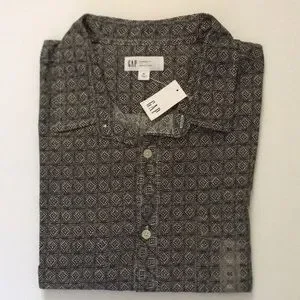 New with tags - GAP Men’s Cotton-Linen Straight Fit Button Up Short Sleeve Shirt. Black and ivory geo diamond print.