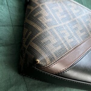 Messenger bag in black buffed calfskin and brown logo patterned coated canvas Detachable and adjustable webbing shoulder strap with lanyard clasp fastening Buffed calfskin trim in brown at face Zip closure Zippered pocket and leather logo applique at interior Tonal textile lining Logo engraved silver tone hardware Approx 9 length x 6 height x 2 width Supplier color Black Tobacco