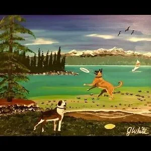 Original acrylic painting 20”x16” painted on primed stretched canvas mounted over kiln dried wooden frame. Have your dog or cat painted into any scene you describe or have a photo of! Let your imagination become my reality!