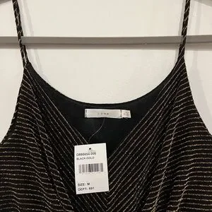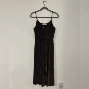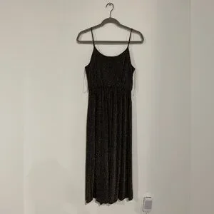 Lush midi dress in size medium. Base of dress is black with gold detailing. Straps are non-adjustable. No pockets. Front of dress has a beautiful twist to accentuate the waist. Never worn and original tags still in place. Originally on sale for $34.99.
