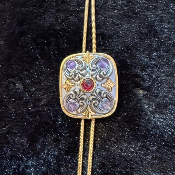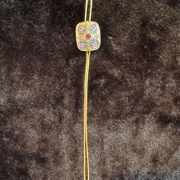 Bring a little bit of the southwest to your outfit with this colorful and delicate bolo necklace. Vintage condition with silver and gold elements, light purple stones in the corners and a beautifully rich red stone in the center. Adjustable up to 24”. Brass electroplated with 24k gold. Designer signed.