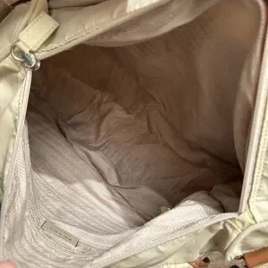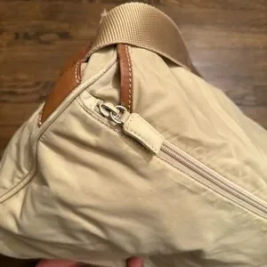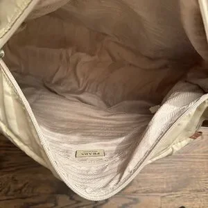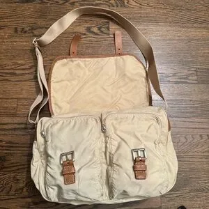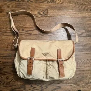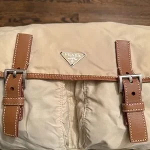 Cream and brown leather messenger bag, vintage Prada. Some signs of wear but generally good very condition.