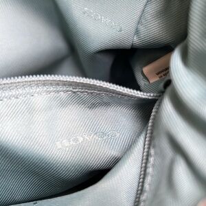 COACH pebbled leather bag in color marine with silver color hardware includes dust bag. The body of the bag is 7” tall and 11.5 wide. Last 2 photos show a very slight, white scuff on front of bag and a very faint mark on the inside of the small zippered interior pocket.