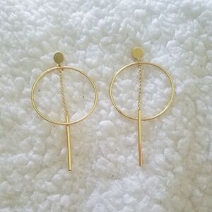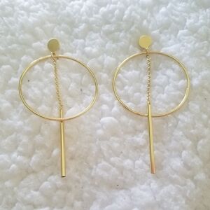 Gold hoop earrings with hanging thread detail. Gold. Stud back closure.