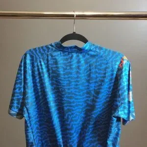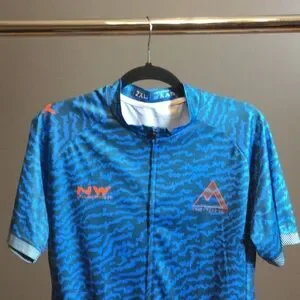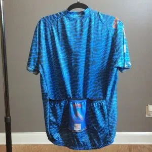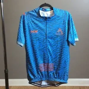 1X NW blue zig zag full zip cycling jersey with 3 back pockets, tailored fit, bottom waist grippers. Bust 22”, low waist 16”, across bottom (without stretch) 16.5”, from mid shoulder to hem 26” front 27” back. Runs small. Calling a 1XL instead of 2XL. No flaws, pet free, smoke free home. Reasonable offers accepted.