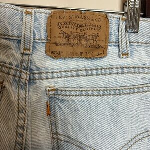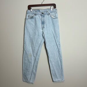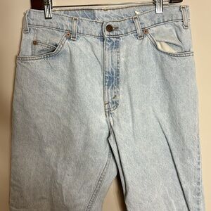 Vintage Levi’s 550 Orange tab jeans. Good distressed condition, with some flaws as shown. Faded paper tag. Measures size 31x28
