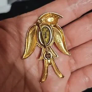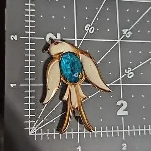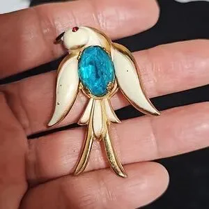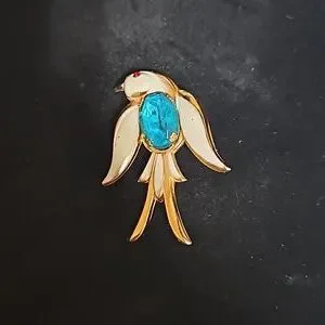 This brooch is preloved in great condition. She features a blue turquoise glass stone and beige enameling. She does have the Coro and Pegasus stamp. She does show wear, but still wearable to enjoy.
