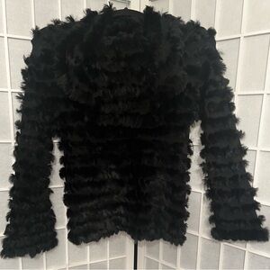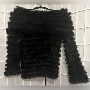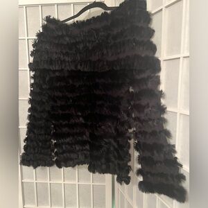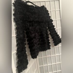 Luxurious black rabbit fur top with an off-shoulder neckline. Super Soft, plush texture designed for stylish warmth. Easy to layer over dresses or casual outfits. Looks amazing with jeans! Very versatile!