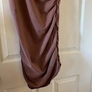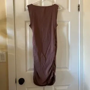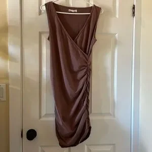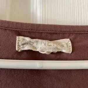 Feel this either snug or runs small, tag says L but pit to pit unstretched is 19 inches, shoulder to hem 35 inches, front has two layers of fabric. Rosy pink/brown