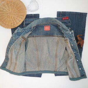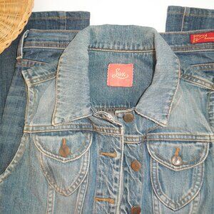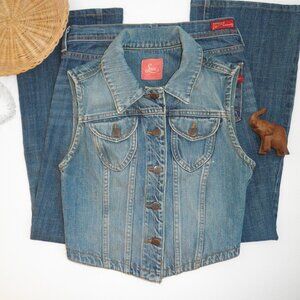 This is an AMAZING vintage button front rigid denim vest from LUX, which is an Urban Outfitters brand. It is from the late 90's and is nice and broken in. There is some wear around the edges, which makes it even better! Classic vest shape but with a collar! This piece is marked a size Small.