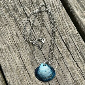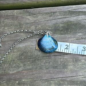 Maine coast necklace featuring a small blue dyed clam shell coated in resin on tarnish resistant chain with lobster clasp closure. Measures approximately 18.5 inches long. Handmade in Maine with ❤️