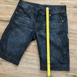 Dark blue denim with a little bit of stretch and really cute pocket details. Inseam is 10 1/2 inches.