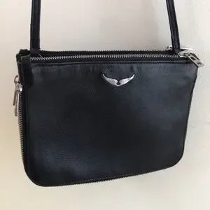 Zadig & Voltaire black leather crossbody bag silver wings logo 2 zipper pouches Zipper on sides open to create more depth and expose silver leather.