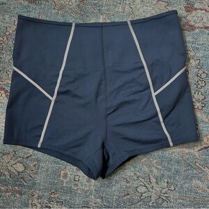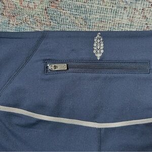 Navy blue Free people yoga shorts with back zipper and white trim detail.