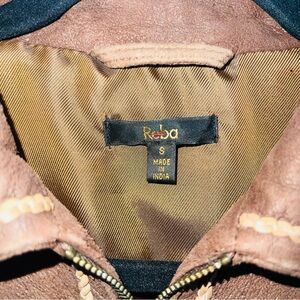 This is a Reba women's jacket made of high quality soft brown leather with tooled and braided stitching details. It features a full zip closure, colorful cutouts stitched on back, and is available in size small.