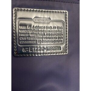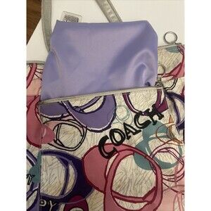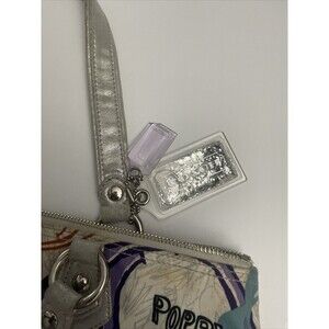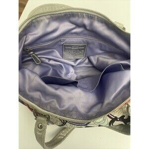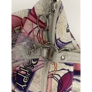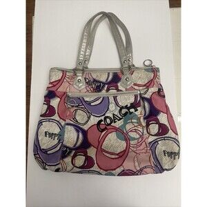 This is a pre-owned Coach Poppy tote bag with a multi-color heart pattern on pink and purple canvas. It has double leather handles with a strap drop of 8.5 inches and silver hardware. The bag has a zipper closure and measures 18 inches in width, 13 inches in height, and 5 inches in depth. The interior lining is purple fabric and it comes with a bag charm. The model number is COACH 17929 and it is a rare find. It is suitable for travel, casual, and business occasions.
