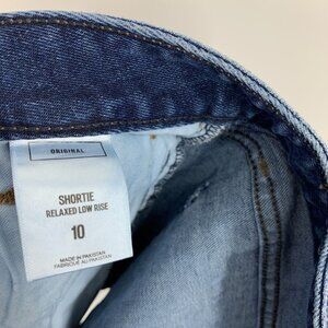 Express Denim Shorts Womens Size 10 Relaxed Low Rise Shortie Blue Jean Cuffed Flip Hem. Great pre-owned condition. Center front zipper and button closure. Front/back pockets.