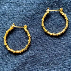 Vintage Gold Toned Hoop Earrings Twisted Rope Design. These are pierced earrings with hinged post and latch closure. Gold toned loop with gold toned twisted rope wrapping around. See photos.