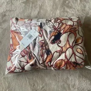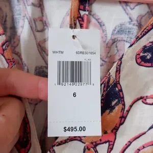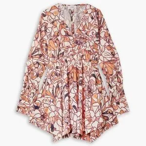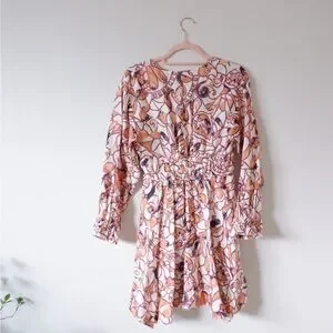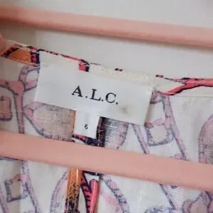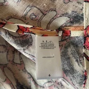 A.L.C. orange and pink linen abstract mini dress featuring deep v neckline with hook and eye closures, gathered empire waistband, elasticated cuffs, inseam pockets at hip, handkerchief skirt and inseam side zip. Unlined.