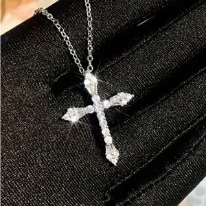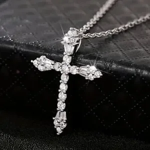 Absolutely breathtaking silver tone cross necklace. With the combination of solitaire and baguette simulated diamonds watch as it glistens from the light. Truly an elegant piece.