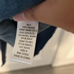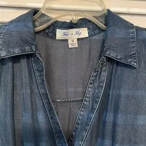 Denim dress with tie belt. Darker color denim. Women’s size small (size 4). Hits right at the knee. Functional buttons down the front. Sleeveless. Pocket on front right.