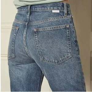 The Tommy is a high waisted rigid straight jean in a medium super eco wash. This upcycled jean is made of recycled cotton, reducing its carbon footprint and water usage.