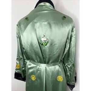 Vintage 100% Silk Kimono Robe Light Green Black XXL Embroidered Bird Floral Leaf
