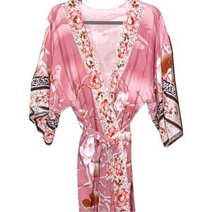 Perfect as a beach swimwear cover-up, a robe, or just as a layering piece over your favorite outfit. Loose flowy relaxed fit, open front, 3/4 sleeves. Pink floral vintage-like shabby chic print, flamingo on the back & black trim along edges. Sash tie with loops at waist.