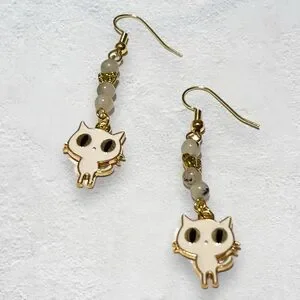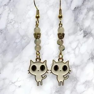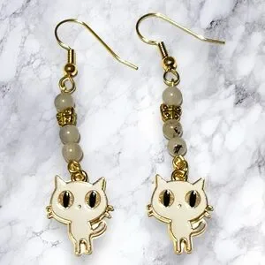 White dangle kitty cat earrings with tourmaline quartz beads and butterflies.