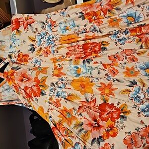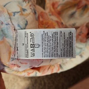 So cute and flowy! It is a tropical or Hawaiian print floral. The straps criss-cross in the back and it zips up the left side. Only worn a few times. The waistband is not elastic. Summer 2018 collection.