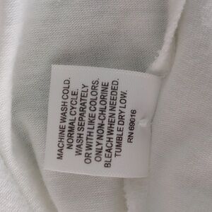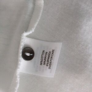 Perfect condition! Wore for just a couple hours and washed once. Great style with nice details like buttons, 3/4 length sleeves, and longer length so it can be worn as a tunic. The white is bright and perfect. Not a single spot on this, no discoloration whatsoever. I never used bleach on it, and I do not use strong fabric softener on my clothing!
