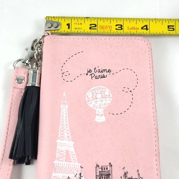 Excellent pre-owned condition, Claire's cute wallet in light pink with whimsical "je t'aime Paris" print on front and fun black tassle detail. Features snap closure, back zippered coin pocket, 6 card slots and 2 bill compartments.