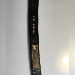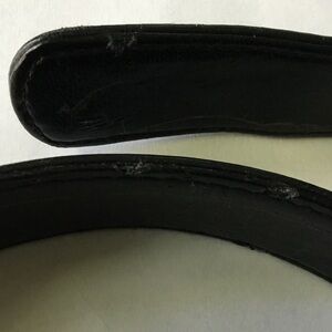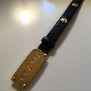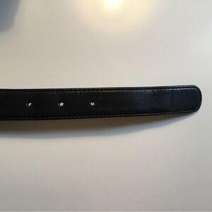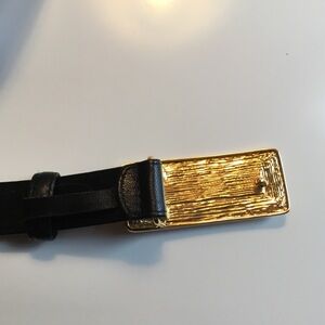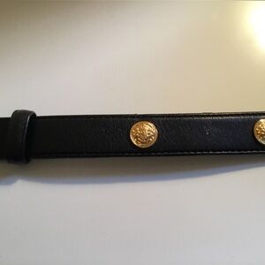 Black with gold hardware, size medium (36 3/4”in length with buckle and 34” without measurement of buckle). Good condition! It does have a few imperfections (see photos). Some wear to the inside of the belt with rubbing, cracking lines and small divots. From a pet free and smoke free home.