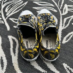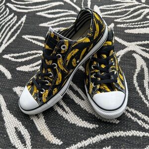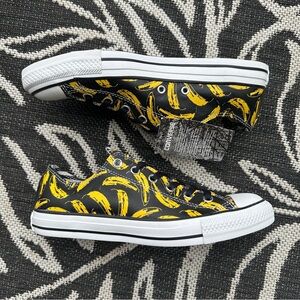 These Converse Chuck Taylor Andy Warhol Banana Low Top feature an all Black Leather upper in the classic Chuck Taylor Low Top body with a yellow banana inspired from Velvet Undergrounds album.